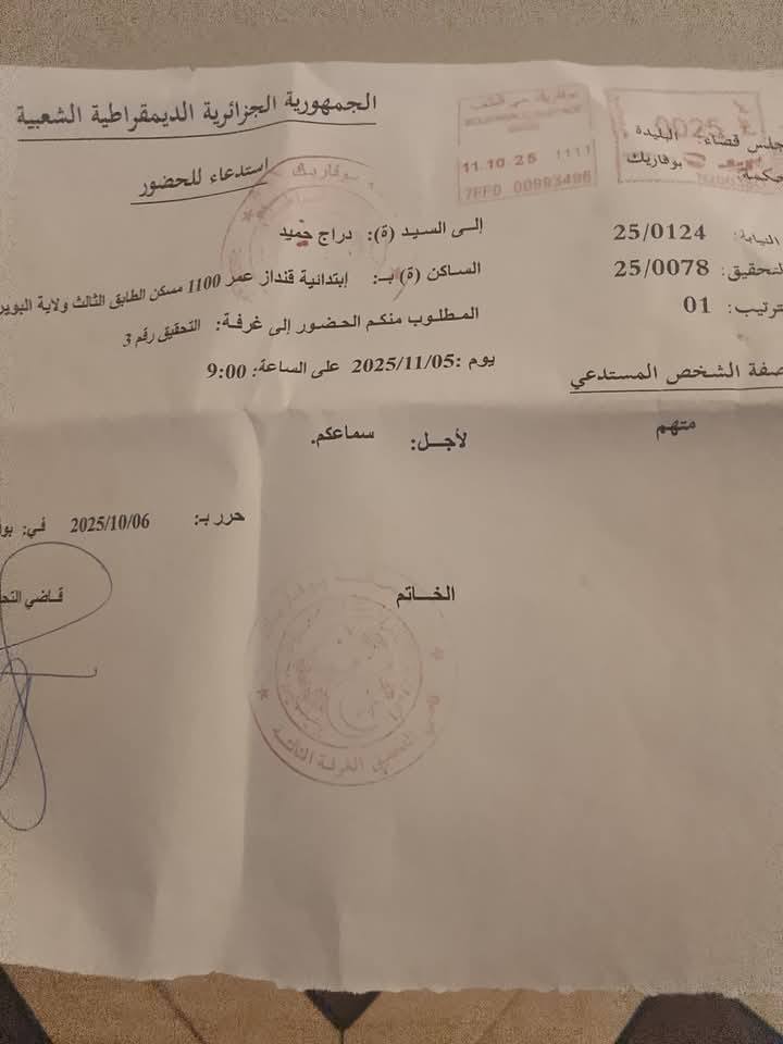 Boufarik (Algérie) — L’activiste Hamid Derradj a reçu une convocation officielle l’invitant à se présenter le 5 novembre 2025 à 9h00 au bureau du renseignement de Boufarik, dans la wilaya de Blida.